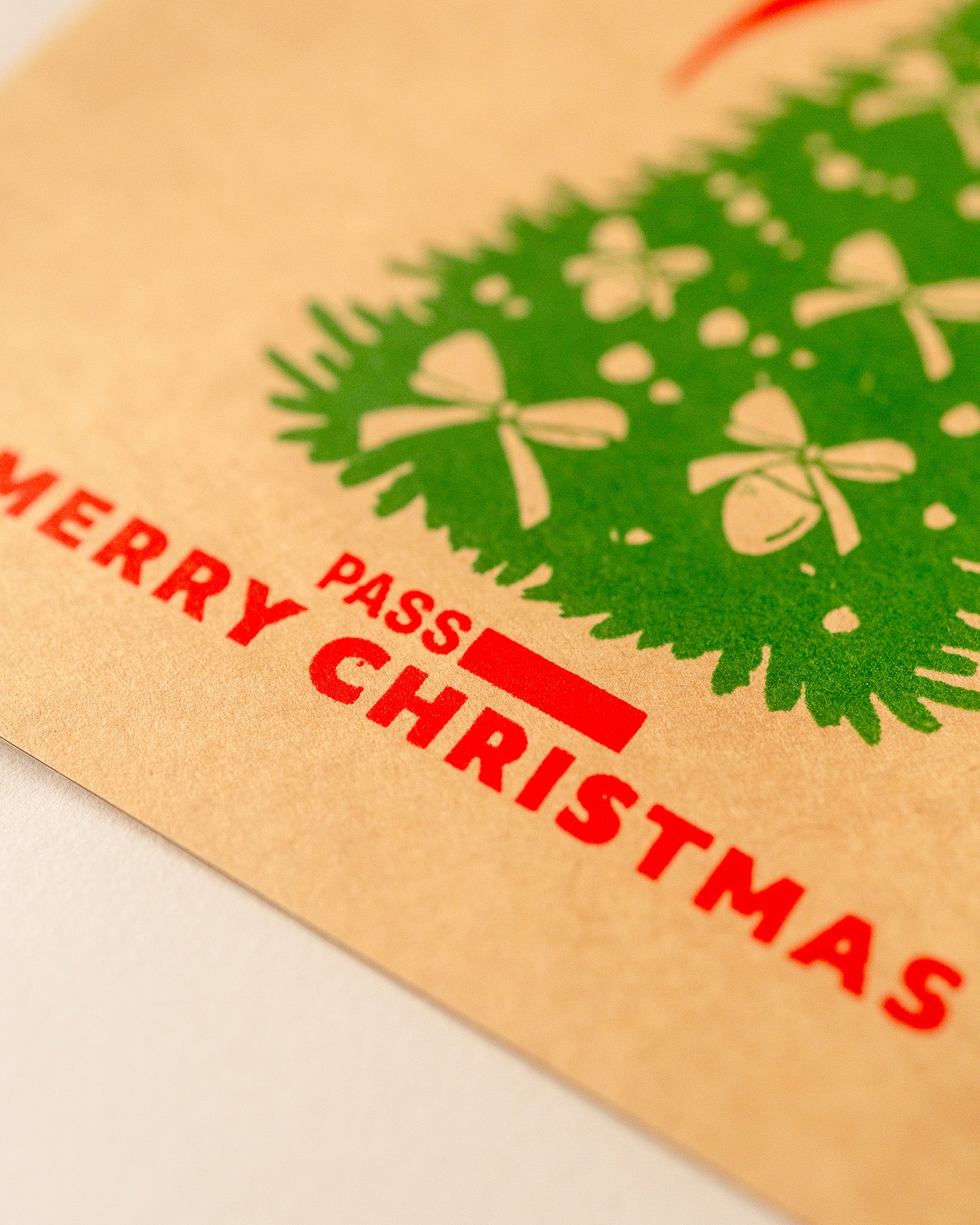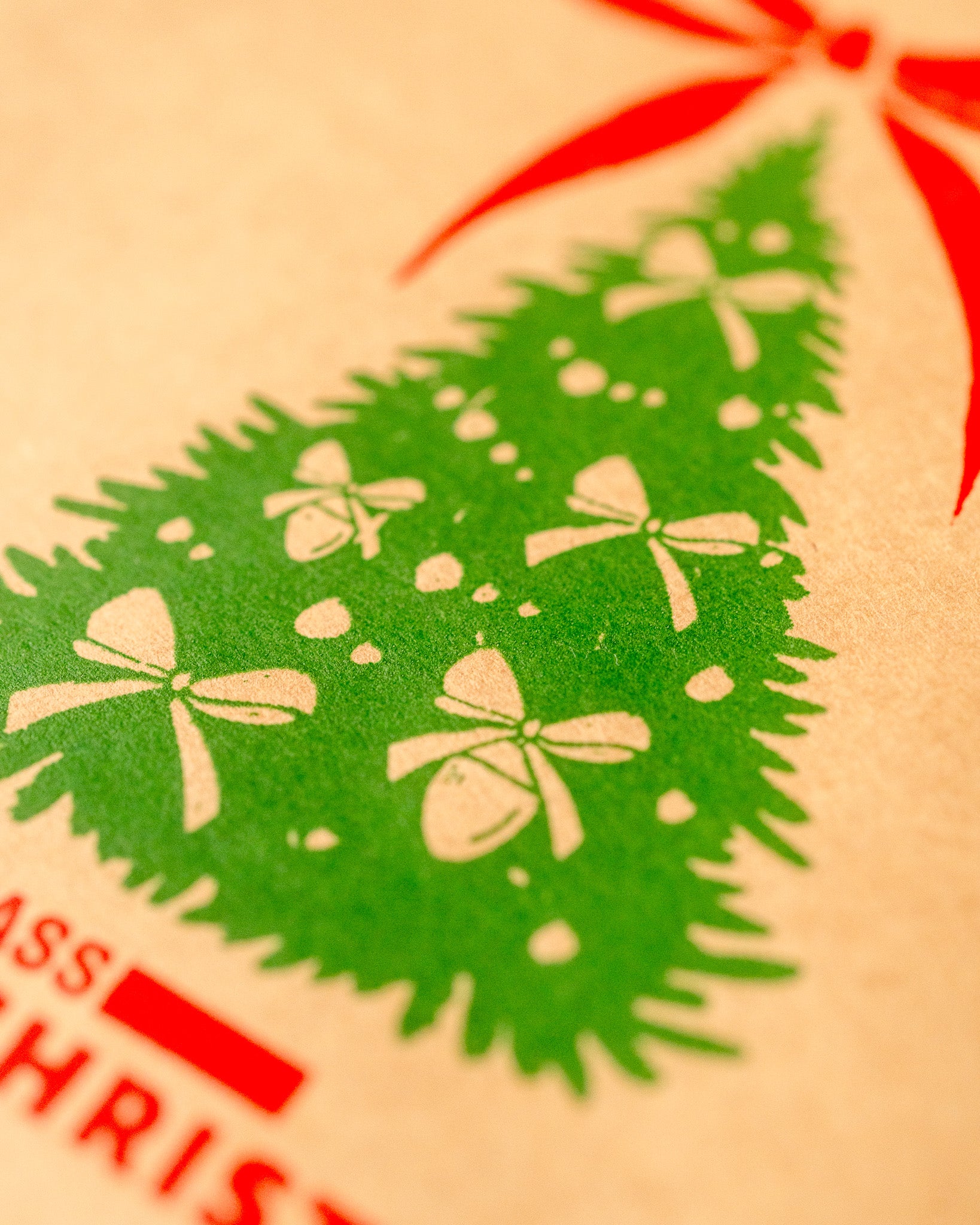 クラフト素材のやわらかな質感に、赤と緑のツリーが季節らしいアクセントになっています。デザインは同じでも一つずつ違った表情に仕上がるので、ハンドメイドならではのあたたかさを感じてもらえるはず。
